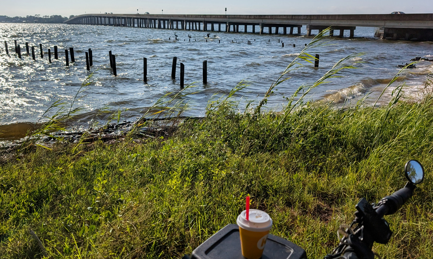 I tend to buy my morning coffee at the Circle K. They have a nice machine that whips up a fresh cup quickly. Then I mosy across the street to the water and drink it there. That bridge is my link to Florida, where I shop for the most part.